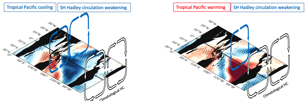 • Both internally driven tropical Pacific warming and cooling can drive similar SH HCS trends, albeit through distinct spatial patterns and mechanisms.