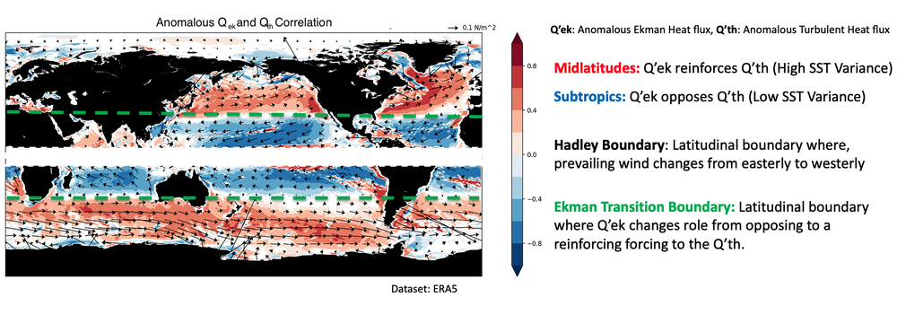 • A projected poleward expansion of the Hadley cell expands the latitude where wind-driven Ekman heat flux opposes turbulent heat-flux driven SST variability.